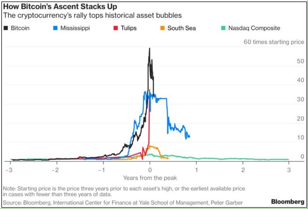 This chart is amazing. It shows the rise and fall of various bubbles in our history. As of today, Bitcoin is the worst. There is a lot of money you can make if you get in AND then out of a bubbling asset class before the pop. Unfortunately, there is a lot of money you can lose too.
