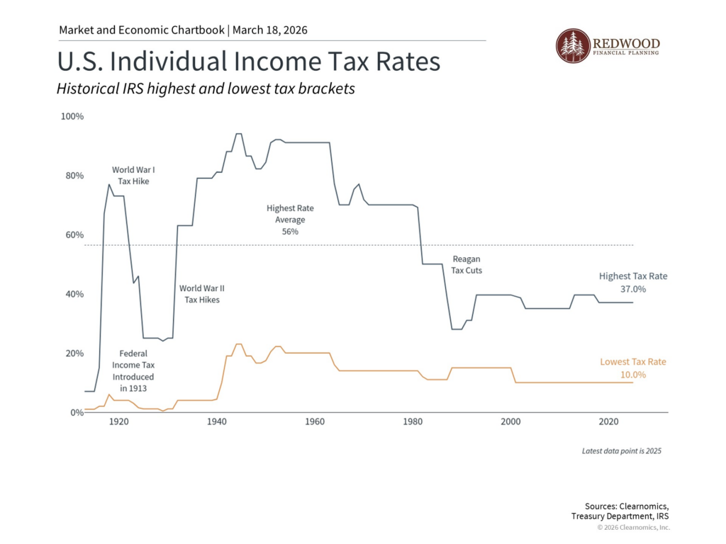 The current individual tax rate structure is an important factor in determining the optimal timing for Roth conversions. As shown in the provided chart, tax rates are currently at relatively low levels compared to historical norms. If you expect your future tax rate in retirement to be higher than your current rate, accelerating Roth conversions now may be advantageous. Conversely, if you anticipate a lower tax rate in retirement, it may make more sense to focus on tax-deferred savings in the present.