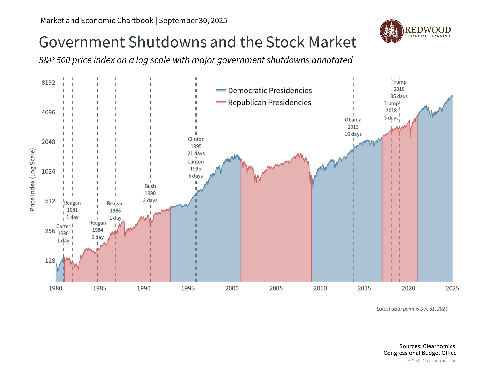 As the accompanying chart shows, government shutdowns have occurred regularly since 1980 under presidents of both parties, with minimal long-term impact on financial markets. The chart illustrates that this was true even during the most contentious shutdowns, including during the Reagan administration, Clinton’s 21-day shutdown in 1995, Obama’s 16-day shutdown in 2013, and Trump’s 35-day shutdown in late 2018 to early 2019 – the longest on record. For investors, shutdowns have generally served as temporary disruptions rather than fundamental threats to economic growth.