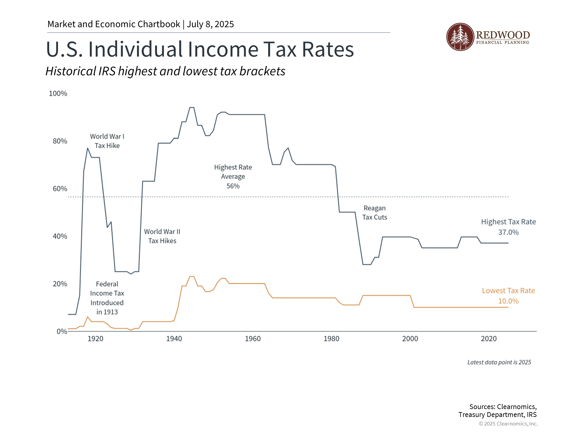 These and many other changes maintain the relatively low tax environment that has characterized the past several decades. As the accompanying chart shows, current tax rates remain well below the peaks experienced during much of the 20th century, when top marginal rates exceeded 70% and sometimes reached above 90% during wartime periods.