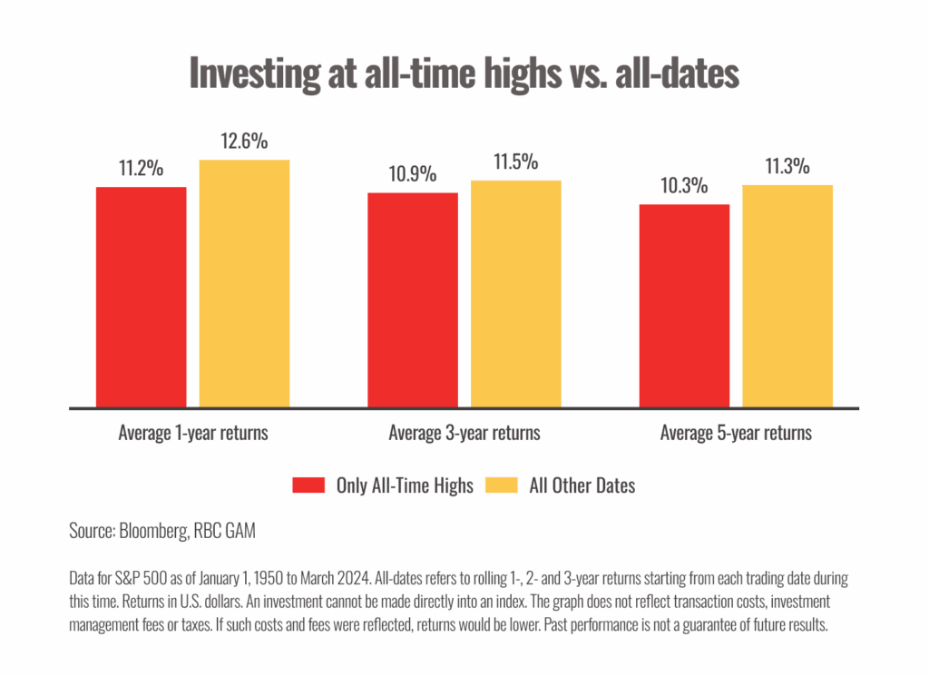 Chart sources: Bloomberg, RBC GAM, 2024 [URL: https://www.rbcgam.com/en/ca/learn-plan/investment-basics/investing-at-all-time-highs/detail]